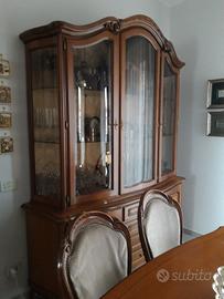 vendo soggiorno in noce composto da madia 230x57, una vetrina 180x50 e tavolo ovale allungabile con 8 sedie imbottite rivestite in velluto. Il tavolo chiuso misura 190x100 mentre aperto arriva a 290 cm.