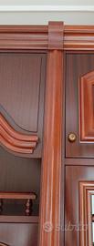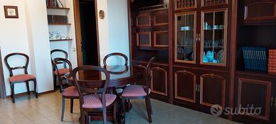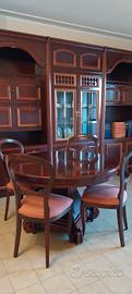 Vendo arredo soggiorno in legno massiccio mogano, composto da un mobile e un tavolo rotondo allungabile corredato di 6 sedie.