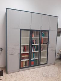 Libreria DRIADE colore grigio chiaro con pannelli laterali e copertura verde scuro, n. 10 ante in legno , n. 4 cassetti e n. 3 ante vetro e metallo 231x231 cm.