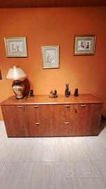 •Mobile basso e lungo con ampio piano d'appoggio, dotato di ante e cassetti. Misure: mt 1, 825 x 0,76 x 0,47.