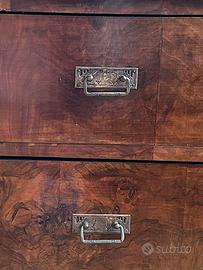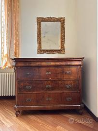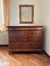Vendesi due pezzi d'arredo tipici dell'antiquariato italiano, risalenti alla seconda metà dell'Ottocento: un comó (cassettone) in stile Luigi Filippo, in noce, in buonissimo stato di conservazione, e uno specchio con ossidazioni del tempo e con cornice elaborata con intagli a motivi floreali e geometrici, tipica dello stile Barocchetto o Eclettico di fine '800 e rifinita in foglia oro, in buonissimo stato di conservazione.