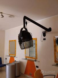 Mobile espositore doppia parete in legno con cassone ribaltabile per biancheria/asciugamani con sportello centrale e cassetto più vari scomparti con ripiani e mensole, Casco asciugacapelli Artem-Basic 4V e Climazon Track ad infrarossi entrambi con braccio estensibile, specchi con cornice più mensole in vetro spesso antinfortunistico, porta utensili con ruote, poltrone più sgabello girevoli con pistone idraulico casco vaporizzatore ionizzante poggia piedi e porta asciugacapelli da parete, cassettiera, etc..
