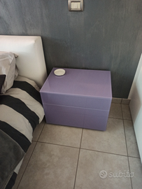 Cassettiera e comodini colore lavanda, finitura in vetro, chiusura slow motion, interni ben rifiniti, come nuovi.La cassettiera si compone di 4 cassettoni molto profondi e uno superiore più stretto. Ritiro sul posto