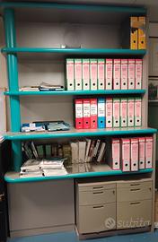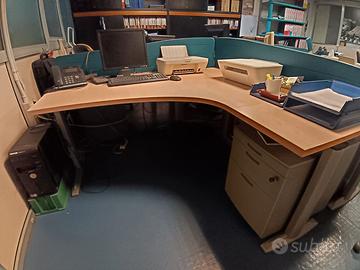Arredo completo per ufficio composto da n.5 scrivanie modulari, di cui 4 con dimensioni 160x160 cm e 1 con dimensioni 180x220 cm, complete di cassettiere. Scaffalatura abbinata alle scivanie, con dimensioni 157x65x250 (h) cm In ottimo stato! Smontaggio non incluso