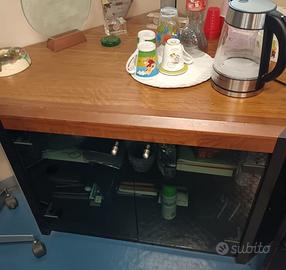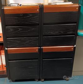 Arredamento per ufficio in legno nero e noce, composto da: n.1 mobile ad angolo con ripiano interno e ante in vetro 90x90 cm n.2 mobili con ante e ripiani interni 100x46x160 cm n.2 mobili con ripiani a giorno 100x46x160 cm n.2 mobili con ante e ripiani interni 100x46x80 cm n.2 mobili con ripiani a giorno 100x46x80 cm I mobili possono essere utilizzati da soli, oppure affiancati e sovrapposti come in foto, n.4 cassettiere abbinate ai mobili In buono stato. Smontaggio non incluso.