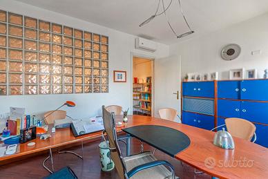1° ambiente : scrivania con penisola - 1 sedia da scrivania con ruote e schienale alto -4 sedie clienti con struttura in ferro e similpelle - 2 cassettiere ognuna di 3 cassetti munite di chiusura - 2 scaffalature ognuna di 3 ripiani con ante munite di chiusura -