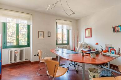 2° ambiente : scrivania ovale - sedia da scrivania con ruote e schienale alto - 2 sedie clienti con struttura in metallo e rivestimento in similpelle - 1 cassettiera di 3 cassetti munite di chiusura - 1 scaffalatura di 3 ripiani con ante munite di chiusura