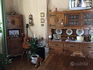 VENDO ANCHE IL SINGOLO PEZZO (sedie no) •Grande Credenza: oMisure: Larghezza 215 cm | Profondità 47 cm | Altezza 190 cm. oPrezzo: € 490,00 •Angoliera: Mobile ad angolo con anta superiore e vano a giorno. oMisure: Larghezza 95 cm | Profondità 65 cm | Altezza 185 cm. oPrezzo: € 290,00 •Tavolo Allungabile: oLarghezza 75 cm | Lunghezza base 150 cm | Altezza 80 cm. oDotato di due prolunghe da 45 cm l'una per una lunghezza totale di 240 cm. oPrezzo: € 250,00 •Set 6 Sedie: Sedie con schienale a cuore e decoro centrale intagliato (vendo solo set completo no singola sedia). oPrezzo per l'intero set di sedie: € 210,00 Offerta Speciale: •PREZZO AQUISTO IN BLOCCO TOTALE: € 1.100,00 Condizioni di vendita: •RITIRO DI PRESENZA A CIRIÉ (TO): Non si effettuano spedizioni; il ritiro è a carico dell'acquirente. •NO AFFARISTI, CURIOSI o PERDITEMPO: Contattare solo se realmente interessati. CREDENZA: Vero pezzo forte della collezione (215x47x190 cm), domina lo spazio con una simmetria impeccabile. Il corpo superiore è un capolavoro di equilibrio: due ante centrali con vetri lavorati "a cattedrale" sono affiancate da due ante piene riccamente intagliate. L'uso del vetro "cattedrale" assolve a una doppia funzione: da un lato garantisce la privacy del contenuto, dall'altro diffonde la luce in modo soffuso, creando un'atmosfera nobile e raccolta. La base operativa è composta da quattro cassetti, ciascuno ornato da una stella intagliata, e quattro ante inferiori che offrono una capacità contenitiva straordinaria senza rinunciare al decoro. La solidità del piano d'appoggio fa da preludio alla versatilità del set da pranzo. IL SET DA PRANZO: TAVOLO E SEDIE Il tavolo (150x75 cm). La sua natura modulare, grazie a due prolunghe da 45 cm, permette di raggiungere una lunghezza totale di 240 cm e ad accompagnare il tavolo le sedie con schienale traforato a cuore, Intaglio centrale con una rosetta stilizzata, seduta ergonomica .