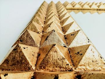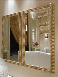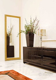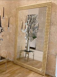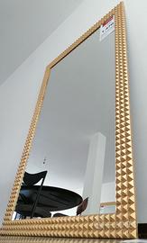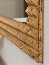 Imponente! La sua Cornice, che abbraccia uno Specchio dello spessore di 5 mm, è in stile diamantato e realizzata in Legno Massello con finitura in Foglia Oro Brunita applicata con colle naturali secondo un antico procedimento utilizzato a Firenze fin dal 1200. Posteriormente un pannello in multistrato.