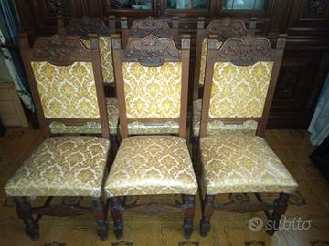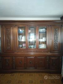 Credenza vetrina in legno masselllo, stile barocco piemontese, con pannelli scolpiti, base con ante e vetrine. Tavolo allungabile con 6 sedie ancora con cellophane.