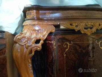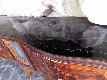 Regalo sala da pranzo molto bella e ben fatta tutta intarziata come da foto completa di vetrina comò uno specchio tutti i pezzi hanno un piano in marmo bellissimo ritiro a carico vostro.