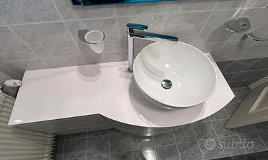 Mobile bagno grigio satinato e piano bianco lucido, moderno con quattro spaziosi cassetti, completo di lavabo e rubinetteria. Misure: 135 cm x 50 cm Valore € 2.800,00