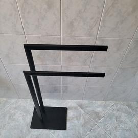 portasciugamani da terra con doppio braccio, caratterizzato da un design moderno e una finitura nera opaca. È una soluzione autoportante che non richiede installazione a parete,ideale per organizzare gli asciugamani in bagno.
