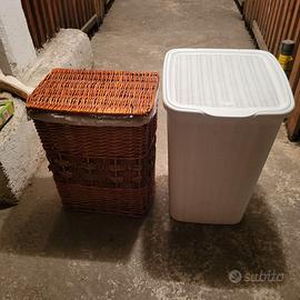 Cesti portabiancheria, uno in vimini intrecciato e l'altro in plastica con un design che imita l'intreccio del rattan. Sono articoli comuni per la gestione della biancheria sporca in casa.