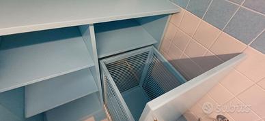 Vendo mobile da bagno / lavanderia per prossima ristrutturazione. Prodotto realizzato su misura, made in Italy, in legno. Dotato di n. 1 anta con 3 ripiani interni, oltre a cestone / carrello estraibile per porta panni o simili con ulteriore ripiano sovrastante. Completo con top rifinito. Misure: larghezza 87 cm, profondità 48 cm, altezza 89 cm. I ripiani interni sono larghi circa 40 cm, mentre il cesto estraibile è alto 60 cm e largo circa 40 cm.