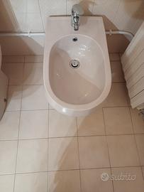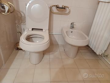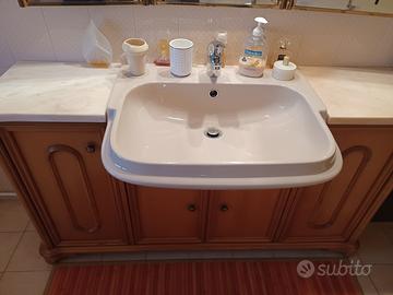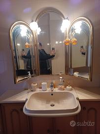 Come da titolo si vende arredo bagno composto da mobile con lavandino lavabo e specchio con cornice dorata, due sanitari wc e bidet comprensivi di vaschetta, tavoletta e rubinetti.