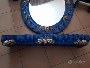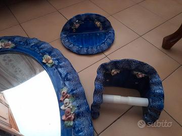Arredo bagno vintage di colore blu con decorazione fiori colorati, in porcellana di capodimonte, composto da 6 pz: specchiera ovale 72×50 cm, mensola, porta saponetta, cartaigienica, spazzolini, scopino. Valuto eventuali offerte.