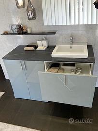 Arredo bagno in laccato lucido grigio con piano effetto pietra.