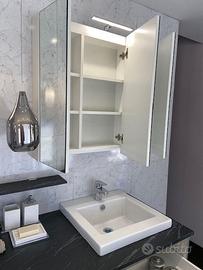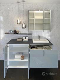 Completo di specchio contenitore, mensola, lavabo, miscelatore, base con ripiani o in alternativa spazio per lavatrice e base cassettone sotto lavabo.