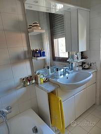 Mobile bagno bianco lucido laccato con piano in marmo e lavabo Ideal Standard cm65×49 con gruppo Grohe. Dimensioni cm123L×200H×36P. Dimensioni specchio cm87×110 con tre luci di cortesia e trasformatore. Armadietto cm35L×15P. Nella parte inferiore due cassetti e tre ante.