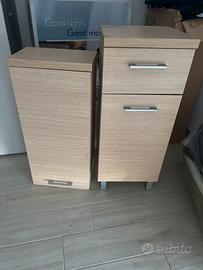 Due mobiletto per il bagno . Il primo con piedini e cassettiera ed anta delle dimensioni di larghezza 33cm e di profondità 32 cm ed alto 85 cm da appoggiare al suolo, il secondo con anta di altezza 67cm e largo 33cm da fissare al muro