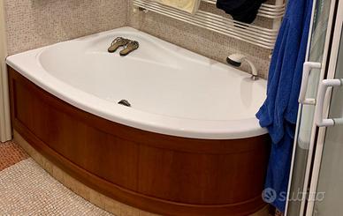 Vendesi arredo bagno composto da mobile in legno con piano in marmo e lavabo integrato + specchio + vasca con struttura in legno. Misure mobile: altezza 81 cm, larghezza 62 cm (punto più largo) 50 cm (punto più stretto), lunghezza 122 cm. Si valutano anche vendite separate.