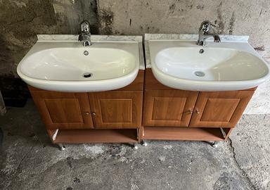 Vendesi mobilio arredo bagno completo di; N.2 mobili sottolavabo doppio sportello con cassettone completi di lavabo e rubinetteria N.2 specchiere complete di portalampada N.1 mobile a colonna con doppio cassetto e mensole Sanitari disponibili in aggiunta sul prezzo. Cassetti/specchi/mensole omessi in foto sono presenti ed incartati. Per misure o info supplementari in chat. Vendita naturalmente senza possibilità di spedizione.