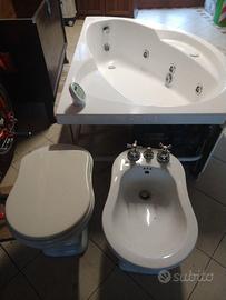 Arredo bagno integro, in buono stato di uso, wc, bidet, lavandino con mobiletti laterali tutti con copertura di marmo rosa e con annessa vasca idromassaggio.
