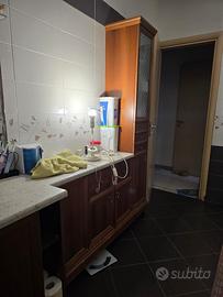 Vendo arredo bagno completo. Il primo mobiletto ha due cassetti alti ed una mensolina in vetro. Il secondo elemento ha il lavabo e un mobile a due ante ampio. Il terzo elemento ha un anta a destra, divisa in due scomparti da una mensolina ; ha due cassetti ed una altro scopartimento a due ante. Il quarto elemanto ha due sportellini uno diviso in due scompartimenti, e l’altro in tre scompartimenti. Tutti con il pianale in marmo.