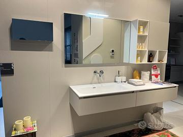 Piano di lavoro in mineralsolid bianco opaco con lavabo integrato, Miscelatore ad incasso a parete, specchiera con illuminazione perimetrale e lampada led superiore.