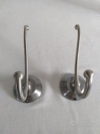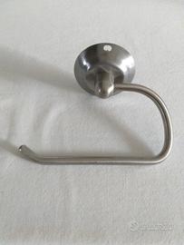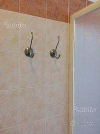 Luci a globo ma senza specchio, mensola in vetro, porta rotolo carta igienica, due appendi accappatoio a muro, porta scopino intercambiabile, in acciaio satinato