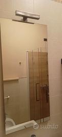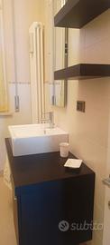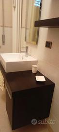 arredo bagno,mobile sospeso con piano in legno marrone scuro, appoggiato sopra ad esso un ripiano largo 105,2 profondo 51 altezza 6 cm , il mobiletto largo 35 profondo 50 con altezza 44,5 cm , lavabo largo 50 profondo 47,5 altezza 15,2 cm , due mensole larghe 40 profonde 19 altezza 6 cm , lo specchio con luce nella parte alta è di dimensioni altezza 95 larghezza 44,5 cm , non ha miscelatore , ho conservato tutta la ferramenta , da ritirare a Gallarate