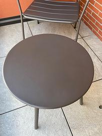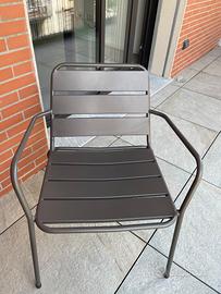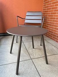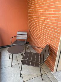 Arredo da balcone-giardino costituito da un tavolino e due sedie-poltrone (impilabili) in acciaio opaco (trattamento anti-ruggine/ resistente all’acqua) colore antracite.