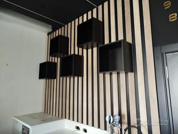 VENDESI ARREDO BAR (COME NUOVO - USATO SOLO 1 MESE) in legno multistrato bilaminato, realizzato su misura •n. 1 bancone dim. 371 x h.95 (h. 115 con alzatina in vetro) largh. 84 cm, completo di: - n.1 banco refrigerato 150 cm - n.1 piano caldo da appoggio 50x35 cm - n.1 drop-in 135 cm - n. 1 mobile neutro per cassa largh. 82 cm •n.1 retro banco dim. 280 x h.95 x largh. 75 cm, completo di: - n.1 mobile neutro per macchina del caffè 100 cm, con tramogge - n.1 mobile neutro da 50 cm per lavabicchieri - n.1 mobile neutro da 50 cm per produttore del ghiaccio - n. 1 lavello ad incasso 40 cm •n.1 parete decorativa alzata (retro banco) dim. 280 x h.218 x sp. 4 cm, completo di: - n.22 listelli 2 x 8 x h. 218 cm effetto legno di rovere - n.1 pannello di fondo 280 x h. 218 x sp. 2 cm, colore nero - n.5 cubi espositivi 40 x 40 cm x p. 30 cm colore nero illuminati con barre led