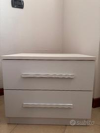 Vendesi arredo camera completa mondo convenienza: 1 letto matrimoniale contenitore, 2 comodini, 1 comó, 1 specchio (100x78,5 cm) e 1 armadio a sei ante con specchio. Bianco effetto legno, pari al nuovo.