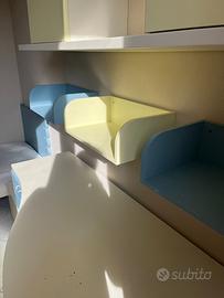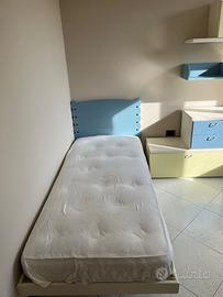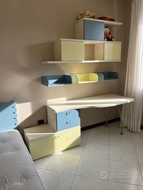 Vendesi arredo per camera da letto singola comprensiva di letto, materasso, scrivania con cassetti e comodino, mensole e sportelli a mensola.