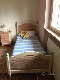 LETTO ROSA/VERDE: singolo in legno massello di abete, composto da testata e pediera, piedini torniti, pomi ai quattro angoli. Misure: H. 97, L. 208, P. 108.