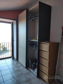 CAMERA DA LETTO: ELEGANTE E MODERNA, con struttura letto matrimoniale simil futon, testiera porta cuscini ed appoggio oggetti (lunghezza 3,30 mt), armadio 4 stagioni con ante scorrevoli (h 2,48mt,Profond. 60 cm, Larghezza: 1,80 mt) 2 comodini con 2 cassetti cad. sistema soft motion MIsure: Largh. 53 cm, h 45 cm, profond. 60 cm), rete matrimoniale a doghe in legno e materasso, cassettiera verticale rovere a 5 cassetti.