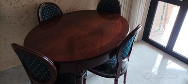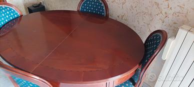 Vendesi causa ristrutturazione arredamento composto da: tavolo in noce pregiato ovale intarsiato allungabile fino a 12 posti con 4 sedie in noce pregiato.Per ulteriori dettagli contattatemi.