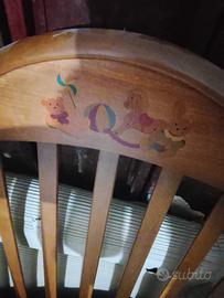 Culla in legno massello con intarzi colorati.