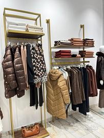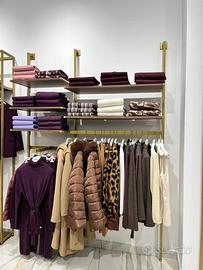 Arredi moderni ed eleganti, struttura in metallo color oro con ripiani in effetto legno, perfetti per boutique, negozi di abbigliamento, valigeria, showroom o temporary store.