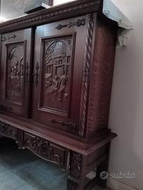 2 Credenze in legno massiccio misure: piccola con due sportelli e due cassetti: lunghezza 135 profondità 46 altezza 134 , grande con 4 sportelli e 2 cassetti sottostanti lunghezza 224 profondità 56 altezza 119. Tavolo largo 90 cm lungo 150 con due allunghi di 60 cm per parte, + 6 seggiole. Prezzo a discrezione dell'interessato