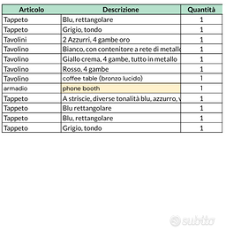 Vendita Arredo Ufficio - €16.000 (prezzo leggermente trattabile) Vendo arredo ufficio completo, **cedibile esclusivamente in blocco**. Le scrivanie sono già smontate e tutto è pronto per il ritiro. 📋 Dettagli arredo L’elenco completo è visibile nelle immagini allegate. Per ulteriori foto o informazioni, non esitare a scrivermi. 📍 Posizione: Il materiale si trova in un magazzino a **Corbetta (MI)**. 📅 Ritiro: Data da concordare insieme. Per qualsiasi domanda o per organizzare il ritiro, contattami direttamente.