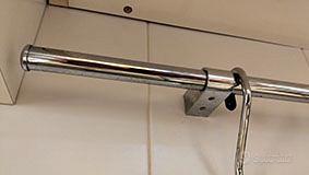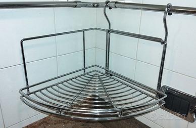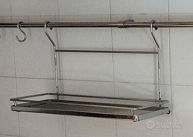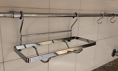vendo usato tubo cromato per gli accessori da cucina. Il tubo ha un diametro di 15mm e si sviluppa su una lunghezza totale di 3.50m, attualmente conformato ad angolo (143+210cm) è in realtà modulabile a seconda della forma del piano di lavoro e si fissa al muro con i relativi supporti (6). E' corredato con 1 portarotolo, 1 ripiano alto di 45x18cm, 1 ripiano basso di 45x18cm, 1 ripiano angolare (raggio 30cm) e 6 ganci (per appendere eventualmente mestoli, palette, frustino ecc). Gli oggetti sono in ottimo stato, al massimo necessitano di minima pulizia. Sto liberando spazio, invito ad osservare altri miei annunci.