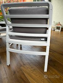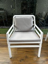 •4 poltroncine Nardi bianche (60x65 cm) con cuscini tortora in tessuto e imbottitura da esterno
