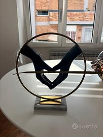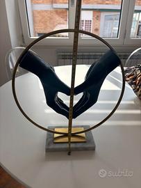 base di marmo bianco circonferenza in ferro colore oro e mani di gesso nero.