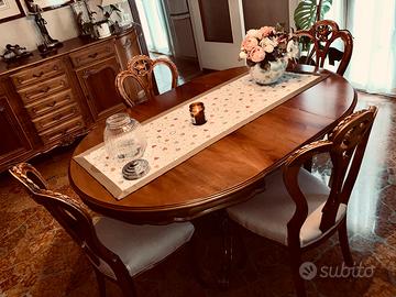 Tavolo in legno massello. Un pezzo unico, allungabile, dotato di vano con prolunga. Le sue dimensioni (chiuso, rotondo, quattro posti comodi - 110x78 cm - aperto, 6/8 posti - 158x78 cm) lo rendono ideale per chi cerca bellezza e flessibilità.