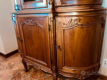 Vetrina cristalliera in legno massello. Un pezzo unico, dotata di vetrine laterali e di un'ampia zona centrale con ripiani perfetta per esporre oggetti, piatti o collezioni di oggetti d'arte. Ha anche delle eleganti ante inferiori con vani completi di comodi ripiani per un pratico ed elegante spazio di stoccaggio. Le sue dimensioni generose (135x210x48 cm) la rendono ideale per chi cerca funzionalità e bellezza.
