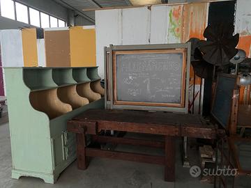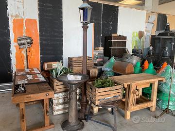 in ferro, lampade a sospensione, lampade a parete, lampade a piantana, tavoli bamconi in legno, armadi cassettiete, poltrone e divani, armadietti in ferro, bauli, cassette della frutta, tavoli da falagneme, lavagne con basemento, ecc ecc