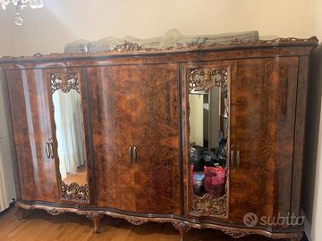 Armadio Chippendale mosso in radica di noce 1950. Dimensioni: 300x 62 x h.206. N.3 ante di cui n.2 con bastone appendiabiti e n. 1 con ripiani e cassetti. Specchi con decori originali. Tutto in perfette condizioni.